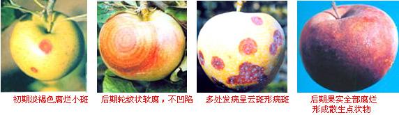 主要危害果實(shí),也可侵染枝干和果臺(tái)。自病斑中心剖開(kāi)果實(shí),可見(jiàn)果肉自果面向果心成漏斗狀變褐腐爛。病組織帶有苦味。病斑邊緣紫紅色或黑褐色,中央凹陷,斑上黑色小點(diǎn)稀疏,呈同心輪紋狀排列,其下果肉局部壞死。枝干發(fā)病與果實(shí)癥狀相似。