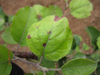 主要為害葉片,也為害嫩枝和果實(shí)。發(fā)病初期,葉片上出現(xiàn)褐色或深褐色小點(diǎn),后擴(kuò)大為直徑5-6毫米的病斑,周圍有紫紅色暈圈,邊緣清晰。天氣潮濕時(shí),病斑上長(zhǎng)出黑色霉層。幼葉被害,有時(shí)葉片呈畸形。為害嚴(yán)重時(shí),被害葉干枯,提早脫落。果實(shí)被害,上生近似葉片上的斑點(diǎn)。枝條被害,也生褐色微凹陷的病斑,病斑周圍常產(chǎn)生裂紋。
