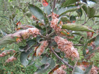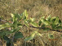 主要為害嫩枝、葉片、新梢,也為害花及幼果。病部滿布白粉是此病的主要特征。幼苗被害,葉片及嫩莖上產(chǎn)生灰白色斑塊,發(fā)病嚴(yán)重時(shí)葉片萎縮、卷曲、變褐、枯死,后期病部長(zhǎng)出密集的小黑點(diǎn)。大樹(shù)被害,芽干癟尖瘦,春季發(fā)芽晚,節(jié)間短,病葉狹長(zhǎng),質(zhì)硬而脆,葉緣上卷,直立不伸展,新梢滿覆白粉。生長(zhǎng)期健葉被害則凹凸不平,葉綠素濃淡不勻,病葉皺縮扭曲,甚至枯死。