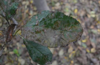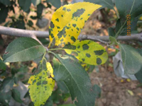 不同蘋(píng)果品種的感病性有明顯差異。高溫多雨,當(dāng)氣溫在10-20℃,光照較強(qiáng),癥狀較重。樹(shù)勢(shì)衰弱時(shí),癥狀較重,幼樹(shù)比成株易發(fā)病。土壤干旱,水肥不足時(shí)發(fā)病重。