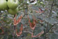 炭疽葉枯病是近幾年才發(fā)生的新病害,流行速度最快。該病屬于氣傳病害,病葉上散發(fā)的子囊孢子隨氣流傳播。主要發(fā)生自嘎啦、秦冠、喬納金等品種上。潛育期短,最快侵染2天后即可發(fā)病,因此治療性殺菌劑效果較差。
