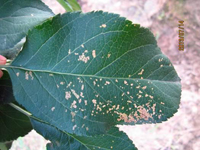蘋(píng)果綿蚜一年發(fā)生8—9代,主要以一齡和少數(shù)二齡若蟲(chóng)在樹(shù)體上群聚越冬。越冬的部位大多在中、下部的主枝和大枝上。在枝干上有愈傷組織、剪鋸口、皮隙縫等處或在根瘤上群集。越冬的成活率隨越冬群體的大小而不同,群體越大,成活率越高。來(lái)年春季,在4月初開(kāi)始為害。5月上、中旬為田間蔓延階段,6月—7月中旬是該蟲(chóng)大量繁殖,蔓延、擴(kuò)散的重要時(shí)期,往往綿狀物累累全樹(shù),造成嚴(yán)重為害。因此5月份蟲(chóng)群尚未擴(kuò)散是防治的關(guān)鍵時(shí)期。7月下旬—8月中旬蟲(chóng)口數(shù)量迅速下降,其原因是高溫和寄生蜂的原故。