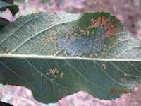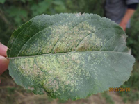 病菌在檜柏上為害小枝,即以茵絲體在菌癭中越冬。第二年春天形成褐色的冬孢子角。冬孢子柄被有膠質(zhì),遇降雨或空氣極潮濕的胺化膨大,冬孢子萌發(fā)產(chǎn)生大量擔(dān)孢子,隨風(fēng)傳播到蘋(píng)果樹(shù)上。銹菌侵染蘋(píng)果樹(shù)葉片、葉柄、果實(shí)及當(dāng)年新梢等,發(fā)病期持續(xù)一個(gè)月。