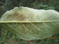 以菌絲體在被害葉和枝條上越冬。翌年春季產(chǎn)生分生孢子,隨氣流傳播,侵染春梢嫩葉。一般果園在花后即可出現(xiàn)病葉,在后半月病葉增多。春雨早而多,夏季有連陰雨,病害發(fā)生早且重,7月上中旬即有落葉。田間在病斑出現(xiàn)后20天即開(kāi)始產(chǎn)生分生孢子,可再侵染。此病喜侵染35天內(nèi)的嫩葉,尤其是20天內(nèi)的新葉。