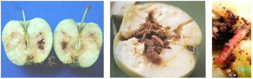 被害果果面有針頭大小的蛀(入)果孔,由孔流出淚珠狀汁液,干涸后呈白色蠟狀物。幼蟲(chóng)取食果肉形成彎曲縱橫的蟲(chóng)道,蟲(chóng)糞留在果內(nèi)呈“豆沙餡”狀。幼果被害后,生長(zhǎng)發(fā)育不良,形成凹凸不平的“猴頭果”;后期受害的果實(shí),果形變化不大;被害果大多有圓形幼蟲(chóng)脫果孔,孔口常有少量蟲(chóng)糞,由絲粘連。