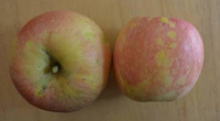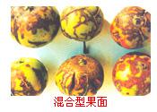 2.花臉型,著色后果面散生近圓形黃綠色斑塊,成熟后為紅綠相間的花臉狀。黃色品種如黃龍、黃沙果、黃太平蘋(píng)果等病果成熟后果面色澤不勻,出現(xiàn)濃淡相間的斑塊,果面略呈凹凸不平狀。