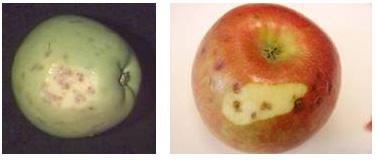 病果皮下果肉首先變褐,干縮成海綿狀,逐漸在果面上出現(xiàn)圓形稍凹陷的變色斑,病斑在黃色或綠色品種上為暗綠色,在紅色品種上為暗紅色。后期病部果肉干縮,表皮壞死,顯現(xiàn)出凹陷的褐斑。病部食之有苦味。