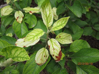 多從新梢嫩葉開(kāi)始,初期葉肉變黃,葉脈持綠,隨病勢(shì)葉片變成黃白色,重時(shí)葉片邊緣枯焦,新梢頂端枯死。