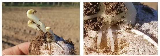馬鈴薯植株生長及塊莖膨大需要從土壤中吸收大量的養(yǎng)分和水分,根系的發(fā)育情況與吸收能力就決定了馬鈴薯植株生長的健壯程度、塊莖的產(chǎn)量和品質(zhì)。馬鈴薯一般是先出芽,后長根,如果根系生長緩慢,會導(dǎo)致出芽生長不良,莖細(xì)瘦、抗病能力弱易感染黑痣病、黑脛病等土傳性病害。因此,促進(jìn)馬鈴薯根系發(fā)育,提高根系吸收能力是馬鈴薯優(yōu)質(zhì)高產(chǎn)的關(guān)鍵。