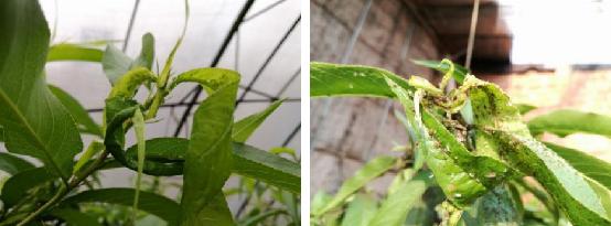 蚜蟲主要為害桃樹幼嫩枝葉,春季當(dāng)桃樹發(fā)芽展葉時,蚜蟲聚集桃樹嫩枝和新葉上,用細長的口針刺入植物組織內(nèi)部吮吸汁液,桃葉受害后呈現(xiàn)黑點、紅色或黃色斑點,葉卷曲皺縮,導(dǎo)致葉片干枯或提前脫落,嚴重影響桃樹枝葉正常生長。同時蚜蟲排泄的蜜露、污染葉面及枝梢,使桃樹生理活動受阻,常造成煙煤病,同時加速桃葉早期落葉。