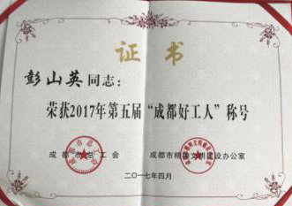2017年4月21日,由成都市總工會(huì)主辦的“我愛成都 勞動(dòng)禮贊——慶!逡弧瘒(guó)際勞動(dòng)節(jié)”頒獎(jiǎng)活動(dòng)上,我公司研發(fā)部彭山英同志榮獲2017年“成都好工人”稱號(hào)。作為全市僅有的10名“成都好工人”獲獎(jiǎng)?wù)咧,她表示將珍惜榮譽(yù),扎實(shí)工作,不斷增強(qiáng)責(zé)任感和使命感,立足本職崗位、爭(zhēng)創(chuàng)一流業(yè)績(jī),開拓創(chuàng)新,再創(chuàng)佳績(jī),爭(zhēng)做時(shí)代先鋒和行動(dòng)楷模,為公司的發(fā)展壯大作出更大貢獻(xiàn)。