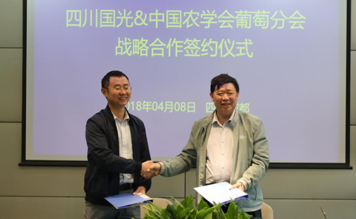 2018年4月8日,中國農(nóng)學(xué)會(huì)葡萄分會(huì)會(huì)長劉俊、秘書長張鶴蒞臨國光,與國光總經(jīng)理顏亞奇就葡萄產(chǎn)業(yè)現(xiàn)狀與種植技術(shù)變革進(jìn)行了交流,雙方在友好協(xié)商、互相促進(jìn)的前提下簽署了戰(zhàn)略合作協(xié)議,國光有幸成為了中國農(nóng)學(xué)會(huì)葡萄分會(huì)第一家戰(zhàn)略合作單位。
