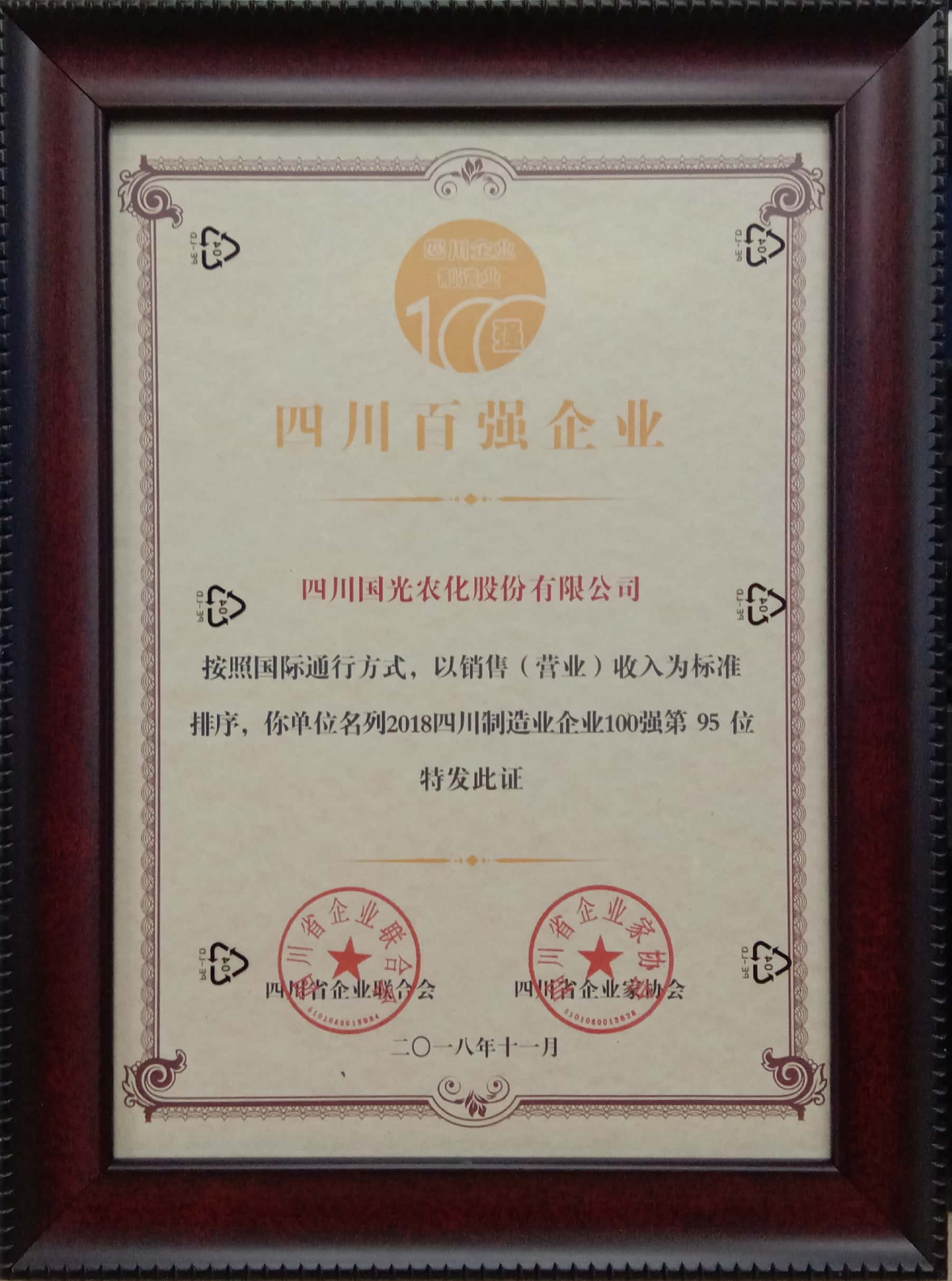 在這次評選活動中,國光股份榮獲“2018四川省制造業(yè)百強(qiáng)企業(yè)”榮譽(yù)稱號。