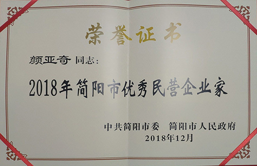 公司被授予“2018年簡(jiǎn)陽(yáng)市優(yōu)秀民營(yíng)企業(yè)”,公司總經(jīng)理顏亞奇被授予“優(yōu)秀民營(yíng)企業(yè)家”。