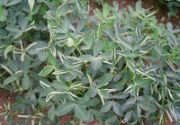 癥狀:花生青枯病是典型的維管束病害,主要自花生根莖部開始發(fā)生。特征性癥狀是植株急性凋萎和維管束變色。該病從苗期至收獲期均可發(fā)生,以盛花期最多。感病初期通常是主莖頂梢葉片失水萎焉,早晨葉片張開晚,傍晚提早閉合。隨后病勢發(fā)展,全株葉片自上而下急劇凋萎,整個植株青枯死亡。拔起病株,主根尖端變褐濕腐,縱切根莖可見維管束變黑褐色,條紋狀,后期病株髓部呈濕腐狀,擠壓切口處,有白色的菌膿溢出。