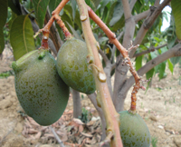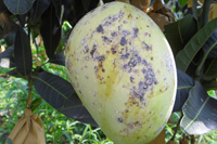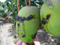 發(fā)病規(guī)律:病原為半知菌亞門擬莖點(Phomopsis mangiferae)和色二孢霉(Diplodia mangiferae)病菌均以菌絲體和子實體(分孢器)在病株和病殘體上存活。氣溫適宜時,分孢器涌出大量分生孢子,借風(fēng)雨傳播,主要從傷口侵入致病。溫暖多濕有利于病菌繁殖傳播侵染,植株、果實病、蟲傷口多樹勢哀落的果實發(fā)病較重。