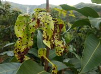 癥狀:該蟲以芒果嫩葉為食料,每年5~11月均有發(fā)生,主要以幼蟲危害嫩葉、葉柄和主脈,被害葉呈褐斑狀,與葉斑病近似,葉背面有小點凸起,后期穿孔破裂,葉片卷曲,嚴(yán)重時致辭使葉片枯萎脫落甚至梢枯,造成植株生長衰弱。