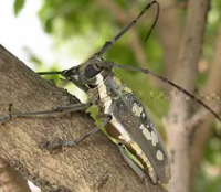 防治方法: 防治脊胸天牛主要有捕殺成蟲、清除卵塊和消滅幼蟲3個環(huán)節(jié)。1、每年4~5月是成蟲大量羽化及飛出交尾、產(chǎn)卵的時間,應(yīng)加緊巡園觀察,發(fā)現(xiàn)成蟲遷飛時可用捕蟲網(wǎng)加以捕殺。2、天牛產(chǎn)卵在枝梢上時往往先咬破嫩梢上的樹皮,然后將卵粒產(chǎn)在其中,且卵粒較大,容易被發(fā)現(xiàn)。發(fā)現(xiàn)卵粒時要立即將其摘除銷毀,以減少幼蟲孵化鉆蛀危害的機會。3、發(fā)現(xiàn)天牛蛀道的孔洞,可用鐵線穿刺孔道鉤殺幼蟲,也可用56%磷化鋁片劑,或以毒死蜱等藥液堵塞蛀道孔內(nèi),然后用泥團(或棉簽)封閉洞口,將幼蟲毒殺于蛀道內(nèi)。
