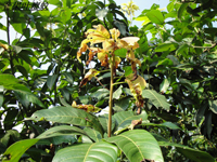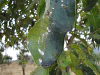 癥狀:介殼蟲為害葉片、枝條和果實。幼蟲和雌成蟲群集在芒果葉背或果實的表面,用口器插入組織內(nèi)吸取汁液,被害部分產(chǎn)生黃色的斑點,嚴(yán)重影響果皮的質(zhì)量。其排泄物能引起煤污病。