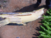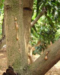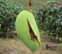 發(fā)生原因:在幼果發(fā)育至橄欖大時即開始裂果,到果實有雞蛋般大小即進(jìn)入迅速膨大期至生理成熟前期時達(dá)到最高峰。裂果率因品種不同,差異也很大。象芽芒一類的品種最易裂果。果實被蟲咬傷或機械傷后,若遇驟雨,吸水過多,則會造成突發(fā)性裂果。所以裂果既屬生理性病害,也受外界環(huán)境的影響。要解決裂果問題,必須采取綜合性的措施。