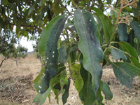 癥狀: 芒果蚜蟲以成蟲、若蟲均集中于嫩梢、嫩葉的背面,花穗及幼果柄上吸取汁液,引起卷葉,枯梢,落花落果,影響新梢伸長,嚴(yán)重時導(dǎo)致新梢枯死。屬常發(fā)性主要害蟲。同時還分泌蜜露,誘發(fā)煤煙病。