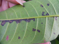 癥狀:該病在嫩葉時即感染,首先從葉背開始,病斑圓形,暗褐色至黑色;在潮濕的條件下,病斑上可見絨毛狀物,后期病葉通常扭曲,畸形;老葉感病后常在葉背上有許多黑色的小凸起,中央有開裂的小斑,嚴(yán)重時可引起大量落葉;未成熟的果實感病后在果皮表面常見發(fā)生許多凸起的小黑斑,中熟的果實感病后在果皮表面常見發(fā)生許多凸起的小黑斑,中央呈星狀裂,病部后期產(chǎn)生大量微小黑點(瘡痂病在果實上發(fā)病最具代表性的特點是“火山口”病斑),這是該病原菌的分生孢子盤,潮濕時其上有稀疏的灰色霉?fàn)钗,病果易脫落?/span>