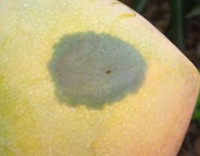 中果期瘡痂病危害嚴(yán)重病果 瘡痂病典型“火山口”病斑癥狀