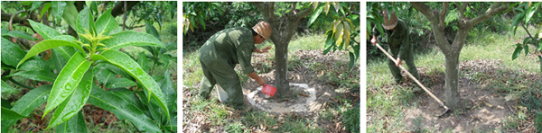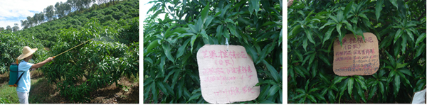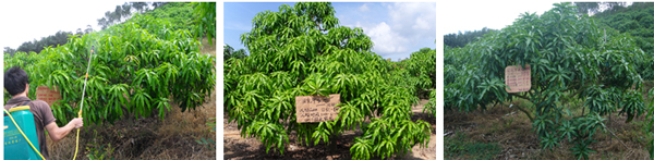 海南三亞福田公司種植戶李伯真18889889828,在2010年6月4日,使用15%國光多效唑可濕性粉劑對金煌芒、澳芒、貴妃芒(樹冠直徑3.5米,樹直徑14cm,土埋60g15%國光多效唑可濕性粉劑;樹冠直徑4.5米,樹直徑14cm,土埋15%國光多效唑可濕性粉劑80g)進行土埋處理。后期表現(xiàn)效果:控梢穩(wěn)定,不“沖梢”;葉片濃綠加厚;枝梢生長短壯。圖為福田公司果園。