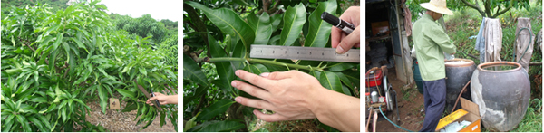 海南三亞英州鎮(zhèn)種植戶蔡桂香,在2010年5月20日,使用15%國光多效唑可濕性粉劑、50%國光青鮮素可濕性粉劑對臺農(nóng)芒進行葉面控梢處理。后期表現(xiàn)效果:葉片濃綠加厚,枝梢及時停止生長,不“沖梢”;枝梢生長短壯。圖為蔡貴香果園。