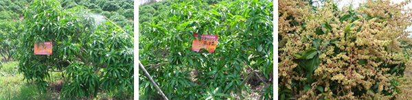 海南三亞英州鎮(zhèn)種植戶蔡桂香,在2010年5月20日,使用15%國光多效唑可濕性粉劑、25%國光甲哌鎓水劑對臺農(nóng)芒進行葉面控梢處理。后期表現(xiàn)效果:葉片濃綠加厚,枝梢及時停止生長,不“沖梢”;枝梢生長短壯。圖為蔡貴香果園。