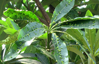 2、根據(jù)調(diào)查發(fā)現(xiàn),成蟲產(chǎn)卵期和若蟲危害期與盆架子新芽、新葉的生長(zhǎng)期吻合,因此針對(duì)易發(fā)區(qū)域,應(yīng)建議在新葉萌發(fā)期普遍噴施內(nèi)吸性的農(nóng)藥如崇刻(50%啶蟲脒水分散粒劑)2000-3000倍進(jìn)行預(yù)防。若已經(jīng)被危害的區(qū)域,鑒于木虱危害的隱蔽性以及噴藥難以接觸蟲體的特點(diǎn),建議選用內(nèi)吸滲透性藥劑,且最好在葉面出現(xiàn)“包狀物”而葉背面未出現(xiàn)黑褐色羽化孔前噴霧,建議用 “必治”(稀釋1000倍)與“依它(稀釋1000倍)”混合液葉面噴施,連用2-3次,間隔5-7天噴一次; 此方案用藥前后的對(duì)比如下(見圖4、圖5)。